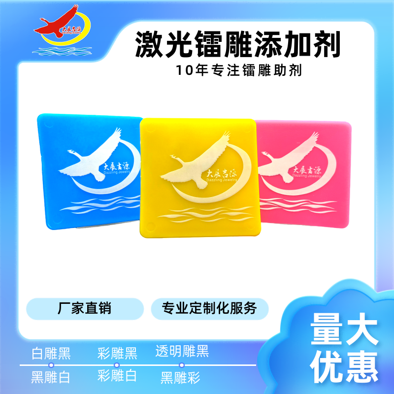 现在市场上使用的镭雕粉一般添加量都是百分之1到百分之2,并不是加镭雕粉越多,镭雕效果越好,如果像PP PC PBT ABS PS PE POM PET这些塑料添加量超过百分之2就会影响塑料原本的物性和改性阻燃的功效,而且添加量加大,镭雕效果的提升也不是特别的明显,小编在这里分享给大家,希望朋友们在以后使用镭雕粉的时候,注意这个情况,可以帮助的大家,我公司大展吉源也是一家自主生产研发镭雕粉|塑料镭雕助剂的厂家,产品是国内自主研发生产,相比于进口产品和国内代理商,我们的价格要优惠很多,目前国内已经有很多大型塑料制品厂家长期使用,产品质量稳定成熟可靠